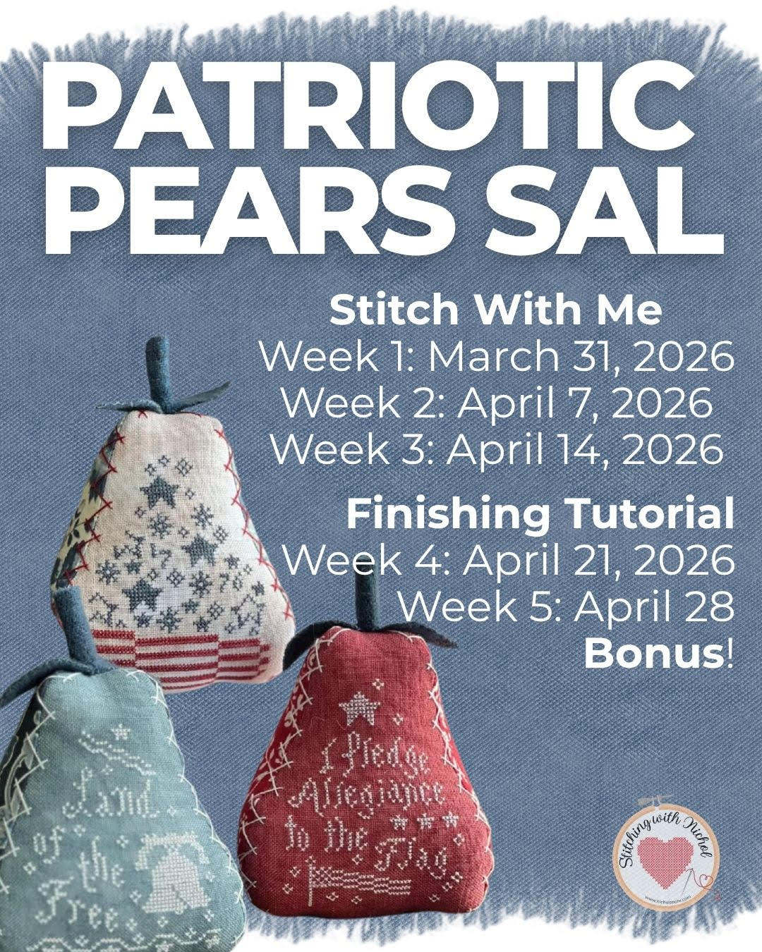 Stitch and finish Annie Beez' Patriotic Pears with a professional teacher, LIVE each week on Youtube!