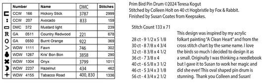 Prim Birds Pin Drum Teresa Kogut Cross Stitch Pattern