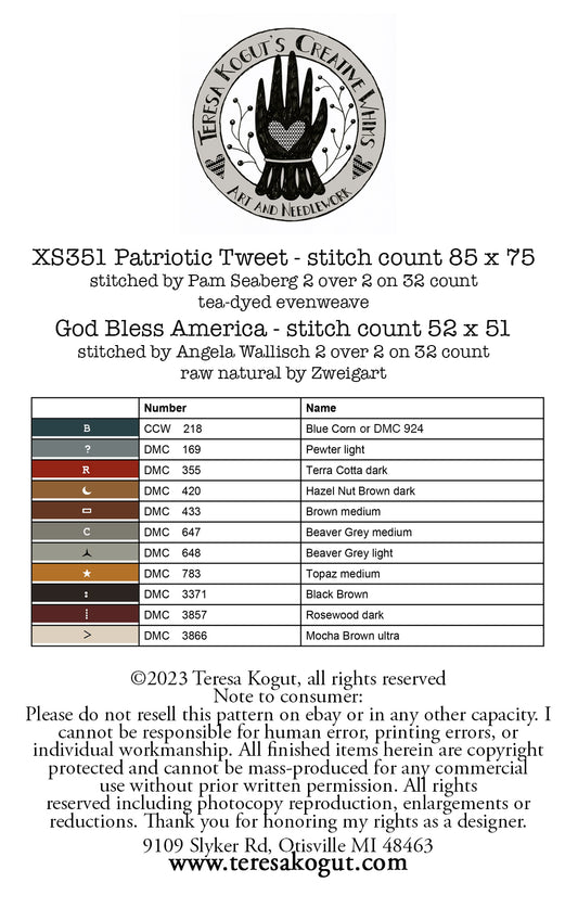 Patriotic Tweet God Bless the USA by Teresa Kogut Cross Stitch Pattern