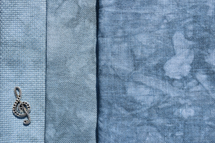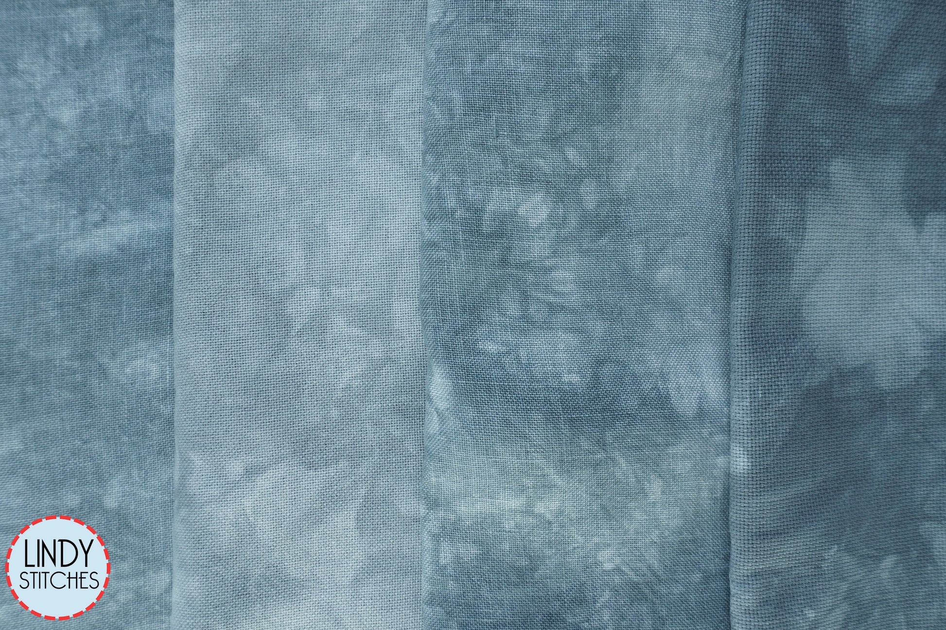 Earl Grey fabric hand dyed by Grace Notes Fabrics. A gorgeous medium blue with great mottling. Fat quarter of fabric measures approximately 17 x 28 inches. This color is closest to DMC 931. Edges are not serged.