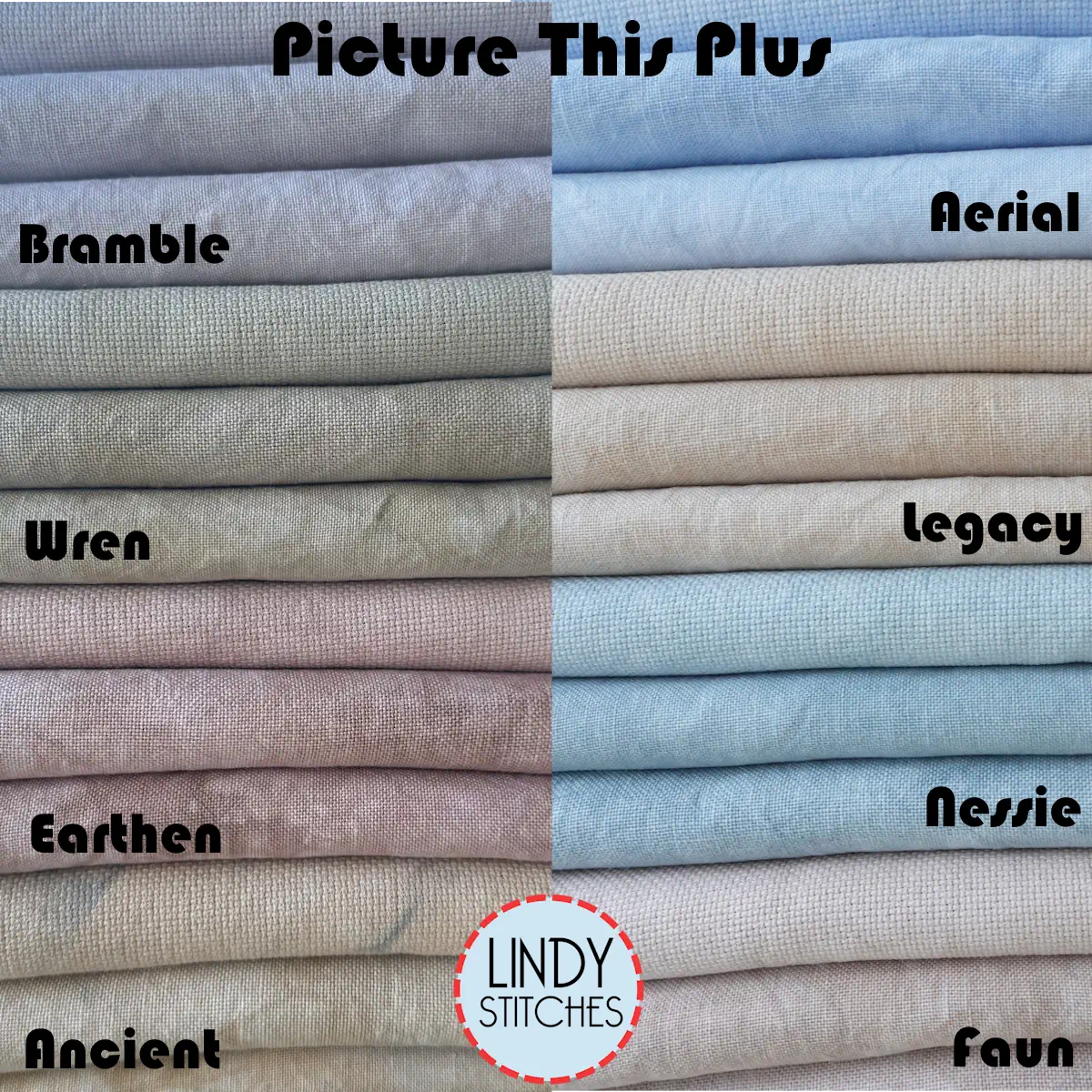 Picture This Plus hand dyed aida in the color Ancient. Ancient is a great neutral with a little pizzaz. The blue veining is so gorgeous and will give your project an instant antique look. Edges are not serged. Picture This Plus uses a Zweigart base.