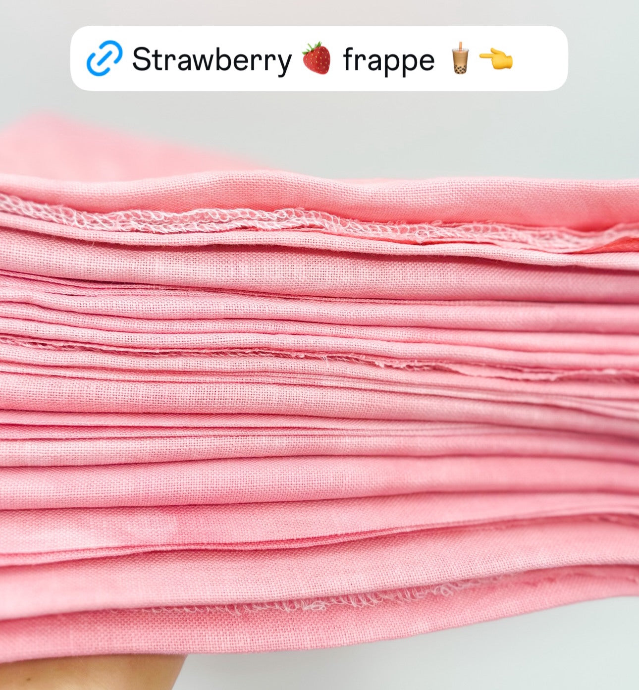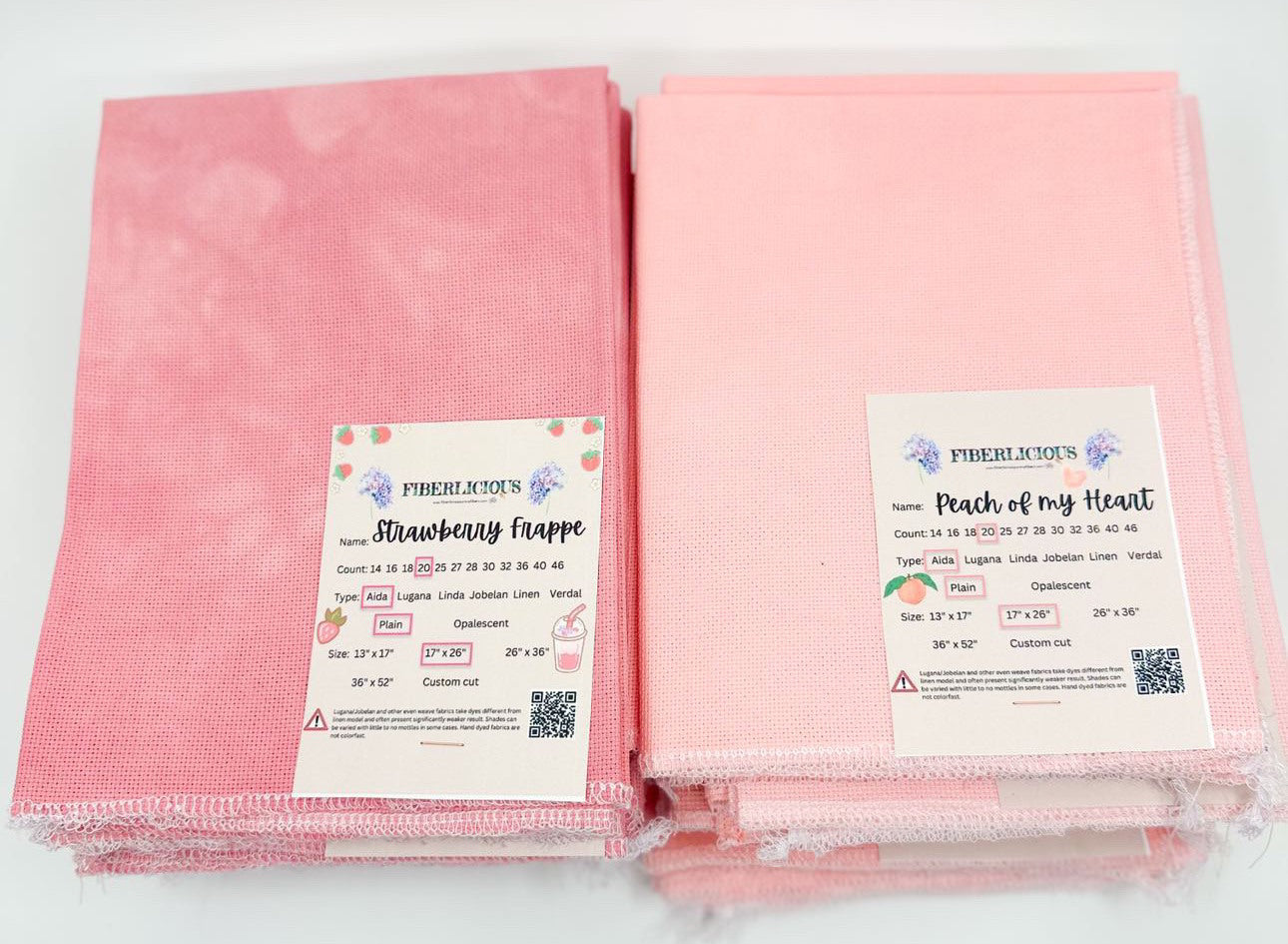 16 count Strawberry Frappe Aida Cross Stitch Fabric by Fiberlicious is our latest hand-dyed fabric that’s as delightful as its name! Inspired by California's famous drink, it contains a refreshing blend of strawberry pink, soft peach, and a special touch of gold, this new colorway is perfect for floral samplers, whimsical designs, and romantic cross-stitch projects.