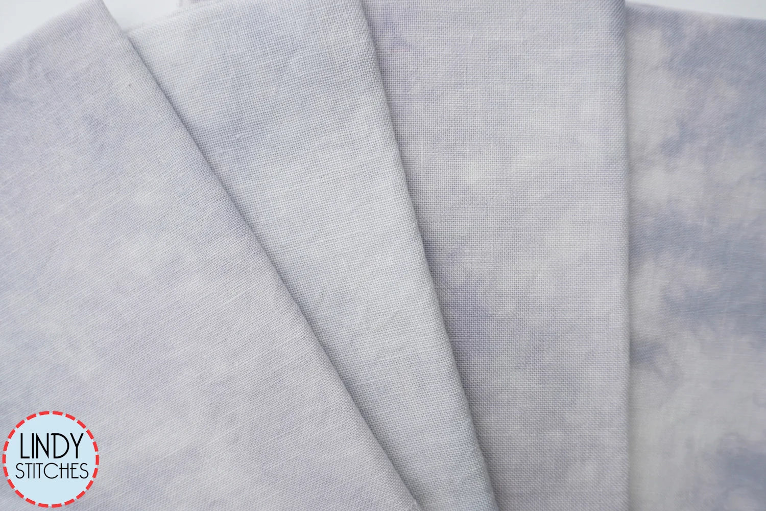 Medusa's Gaze hand dyed linen by Lapin Loops. You will receive one fat quarter measuring approximately 17 x 26 inches. This fabric is a dusty blue. 40 count dyes more mottled than the other counts -- shown the far right.