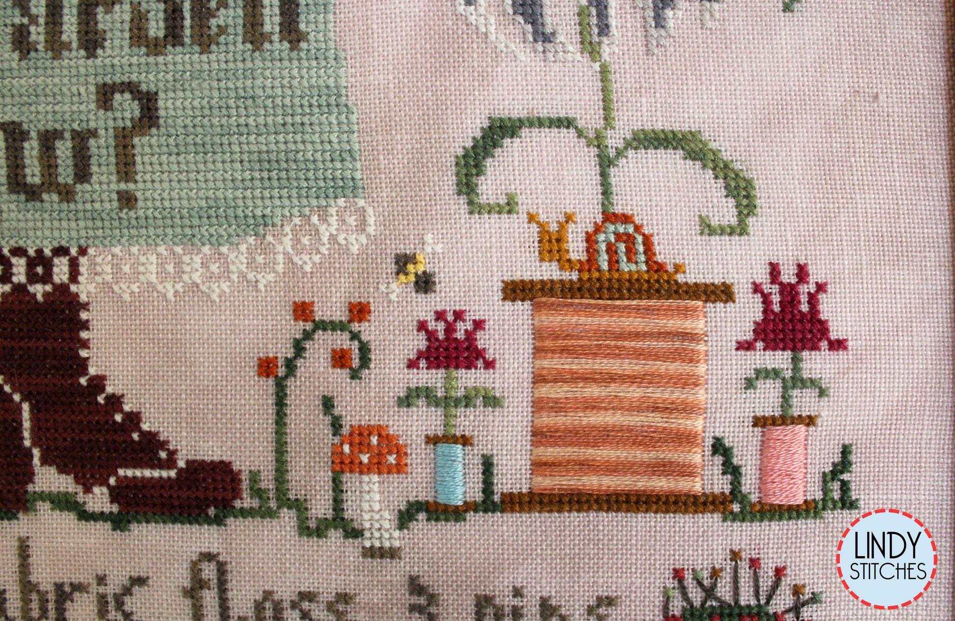 Picture This Plus hand dyed linen in the color Bramble. Bramble is soooo lovely to work on! A very light neutral that under the right light has a slight gray / pinky-purple tone. I used this fabric for the Day version of Mary Mary Needleworker. Approximate DMC shade: 06. Edges are not serged. Picture This Plus uses a Zweigart base.