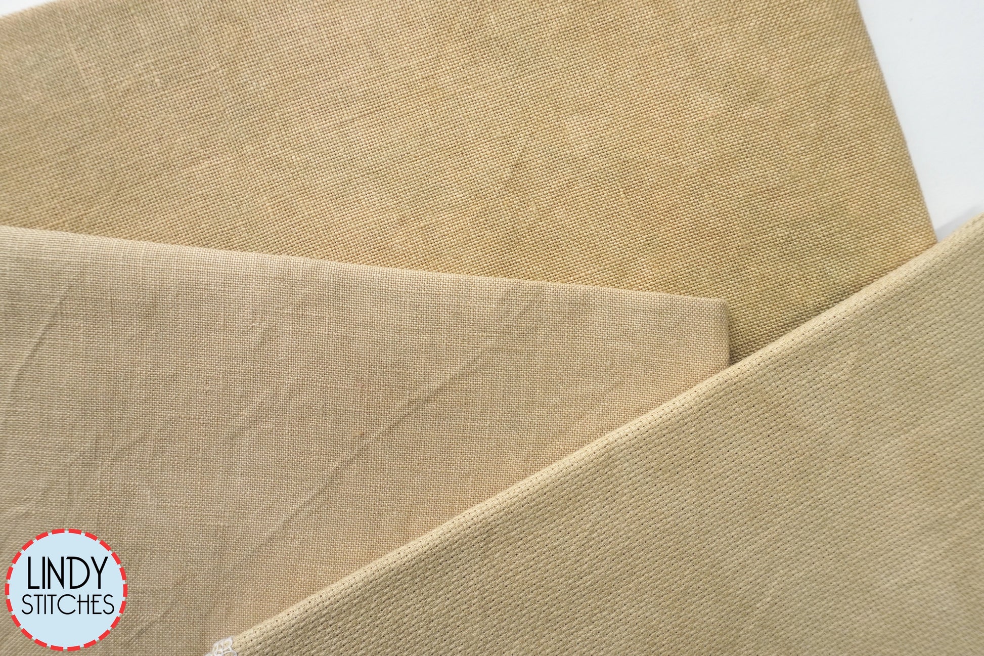 Chai Loves You Linen Cross Stitch Fabric by Fiberlicious is a gorgeous neutral that will serve as a lovely background for so many different projects. In 32 linen, 46 linen, and all aida counts this color dyes a cool-toned brown. 40 count linen and lugana take on a warmer tone. The fabrics shown in the picture from top to bottom are 32 linen, 46 linen, and 20 count aida.