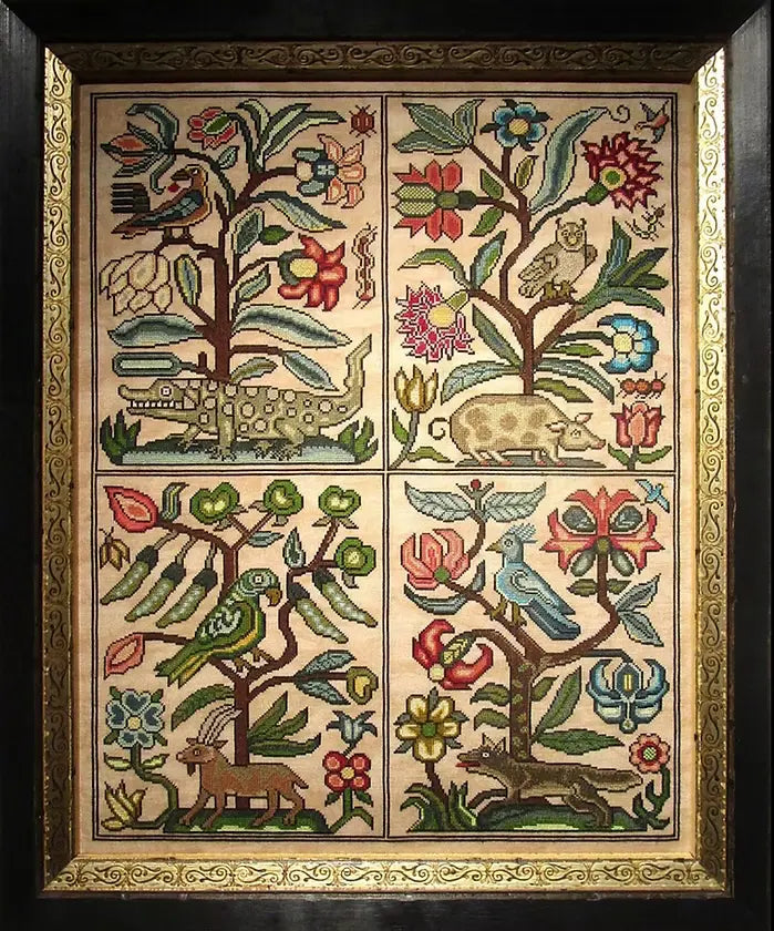 The Scarlet Letter's A Miscellany cross stitch pattern, based on a decorative canvas from the seventeenth century.
