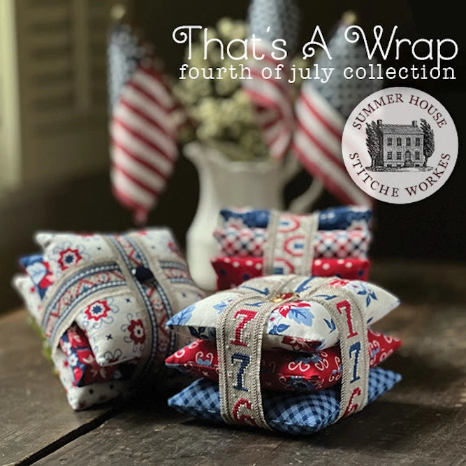 That's A Wrap 4th of July Edition Cross Stitch Pattern by Summer House Stitche Workes. This ribbon wrapped/pillow stack finish that first appeared in our Between Friends - A Fall Sampling book collaboration that we decided to create some more! These are a perfect summertime stitch! And don't forget, America 250 is next year! Get a jump on all your star spangled fun!