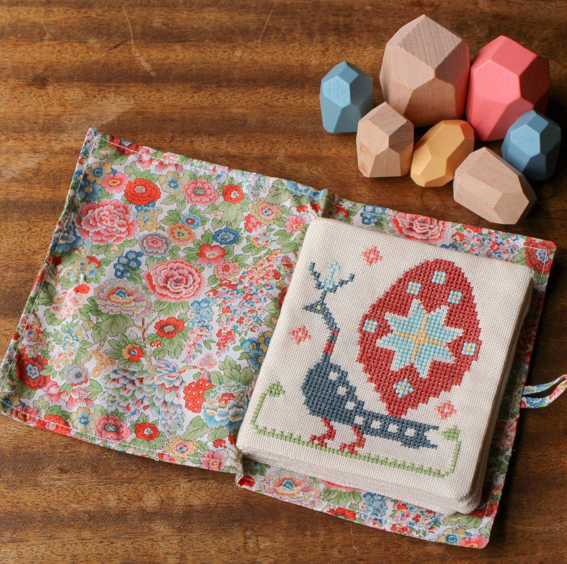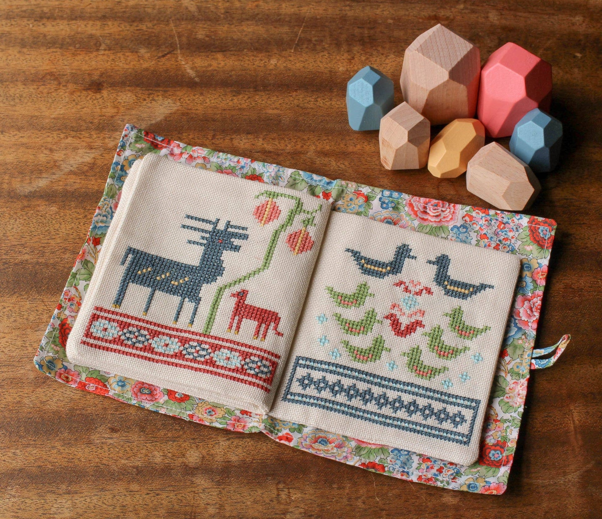 Our charming Byzantine Beasts cross stitch quiet book kit now with lovely Liberty® fabric!