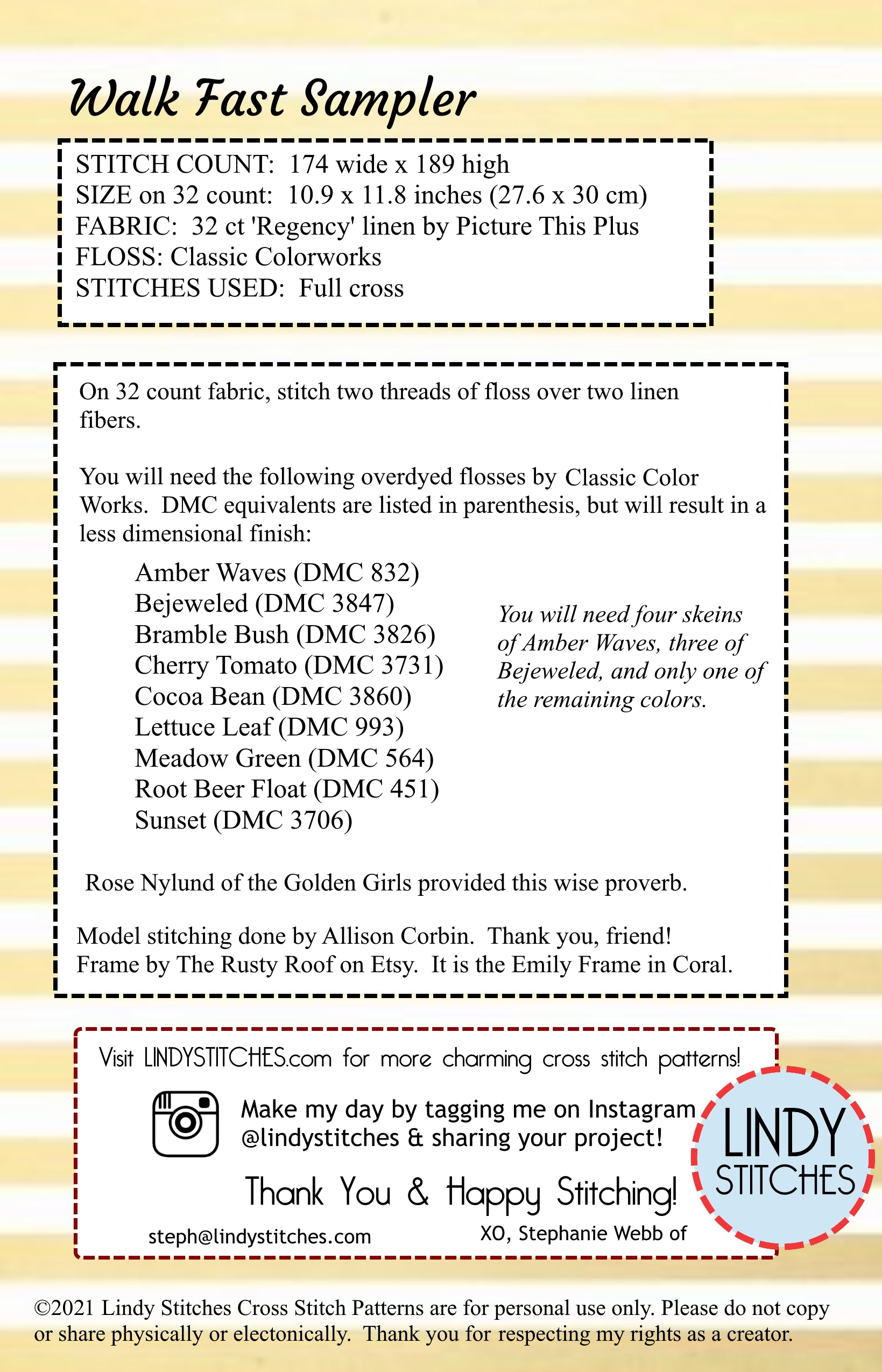 © 2021 Stephanie Webb I Lindy Stitches Lindy Stitches Cross Stitch Patterns are for personal use only. Please do not copy or share. All PDF patterns are copyright protected and may not be redistributed, reproduced, or shared in any manner. Thank you for respecting my rights as a creator.