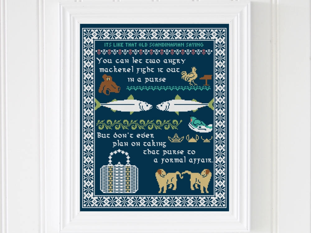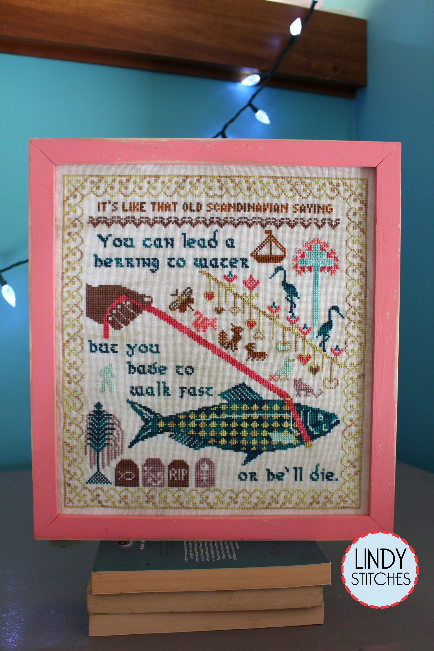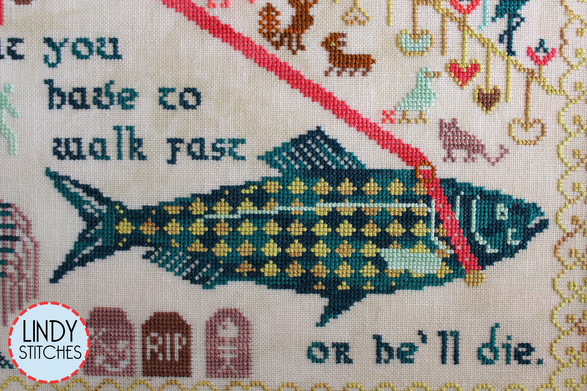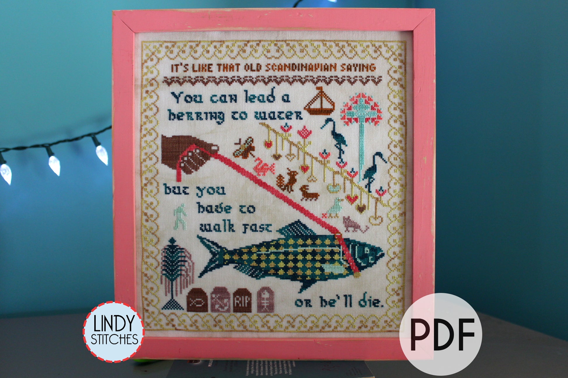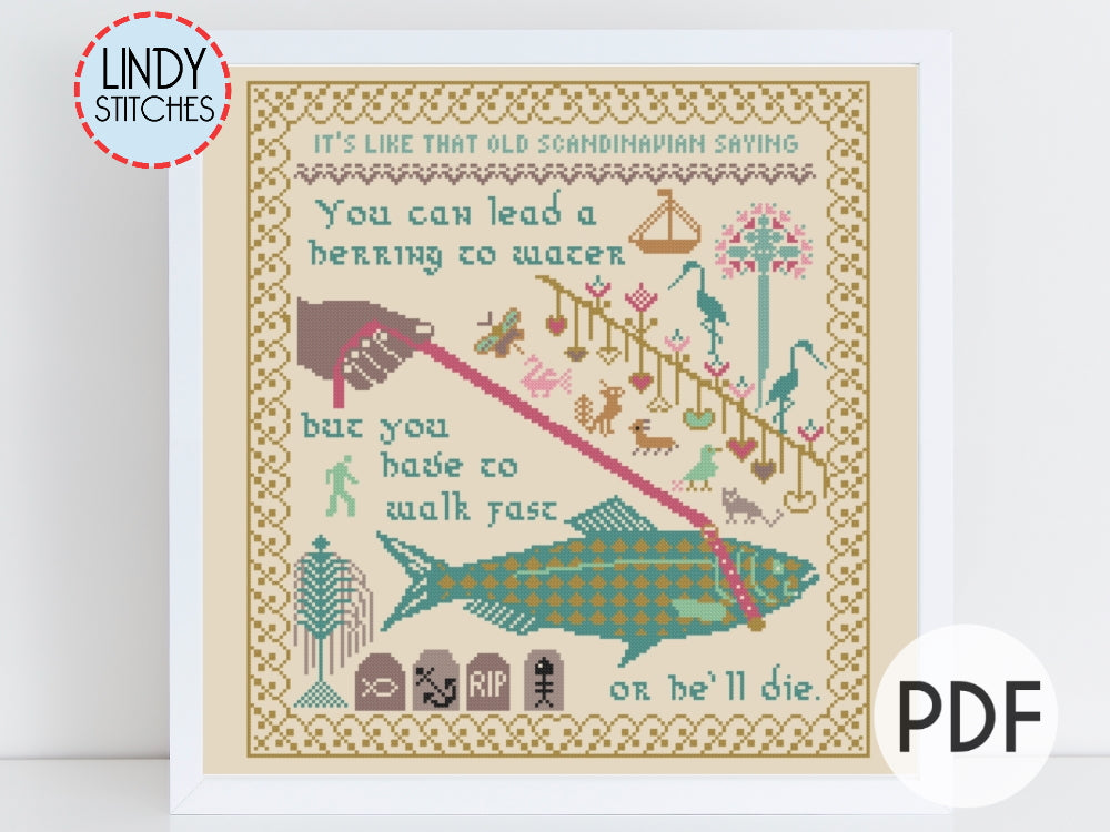 Walk Fast Sampler by Lindy Stitches. A modern cross stitch pattern with wise words from Golden Girl Rose Nylund. The proverb reads: "You can lead a herring to water, but you have to walk fast or he'll die." You can easily use your own color scheme for this pattern, and it contains only full cross stitches, making it beginner friendly. PDF file download. Pattern Keeper Friendly!