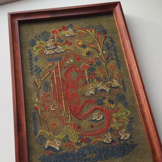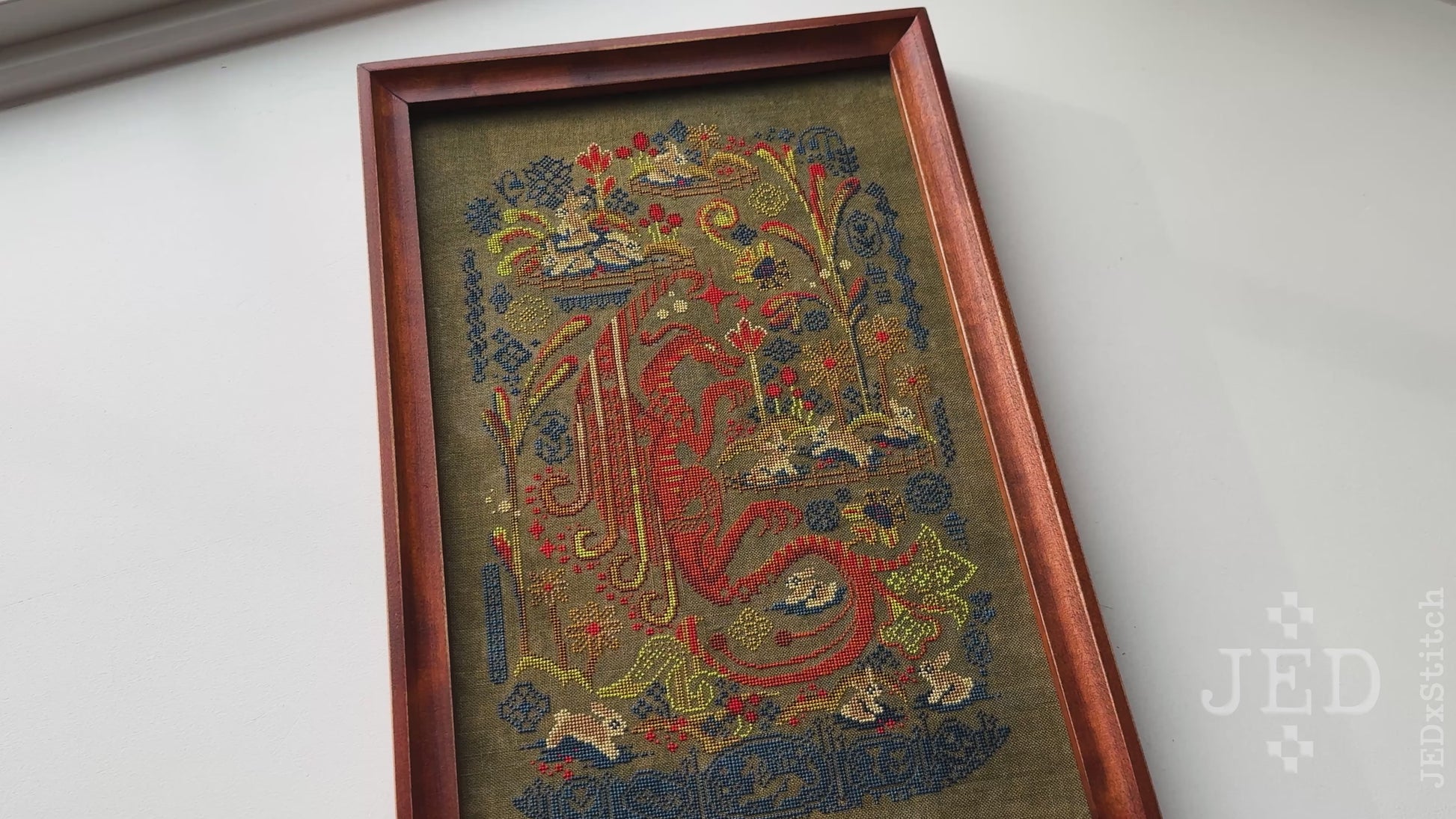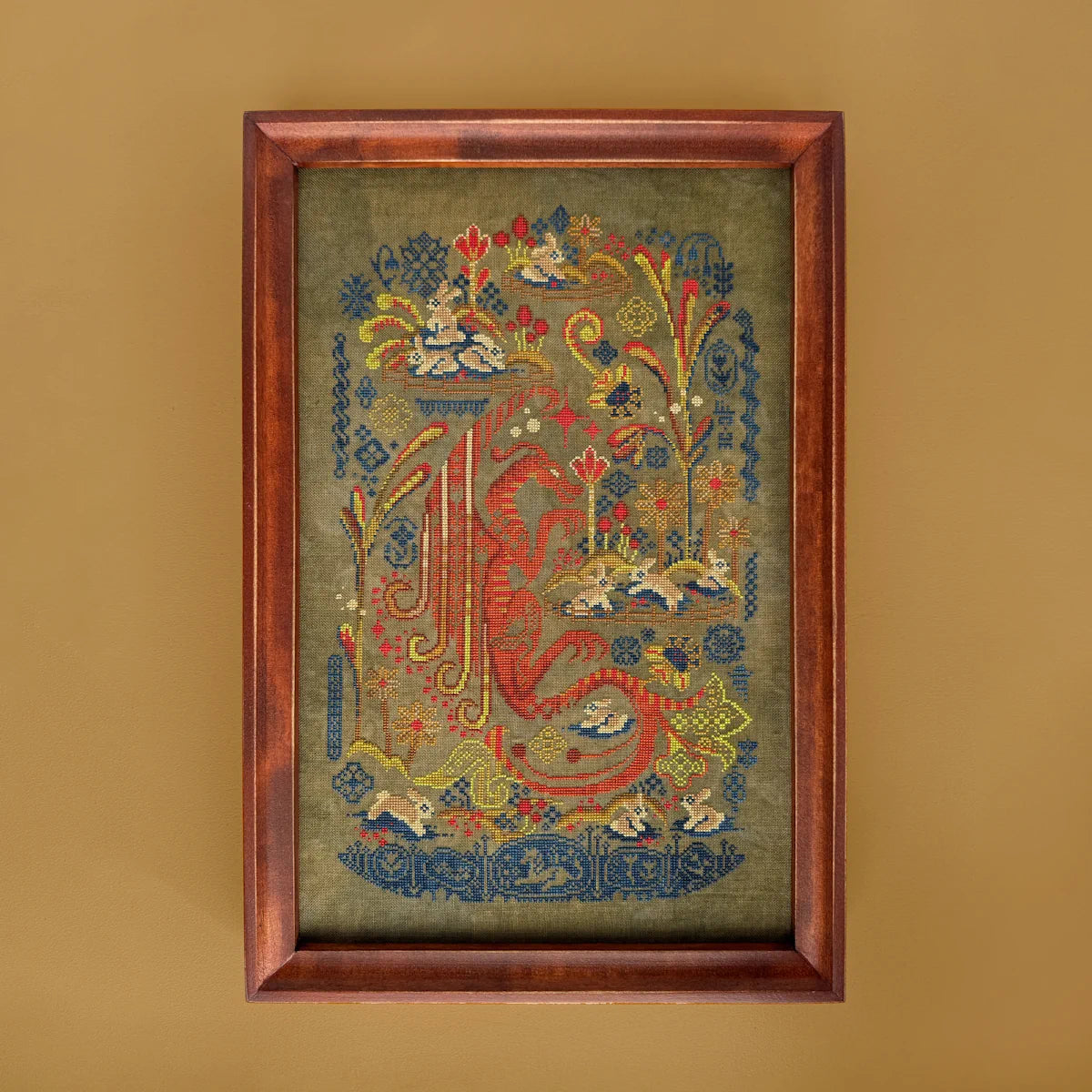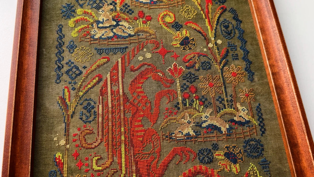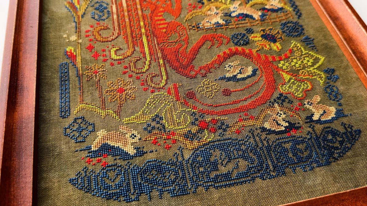 - Model is stitched on 40 count Cedar River Linen “Arboreal” linen.