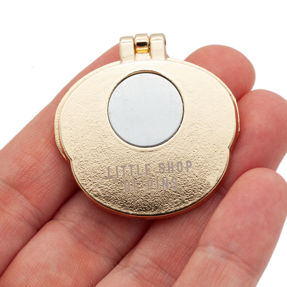 ** Pin Details: * Approx. 1.25" * Soft Enamel Hinge Pin with epoxy coating on lid * Magnetic Backing * extra magnet included for securing to fabric