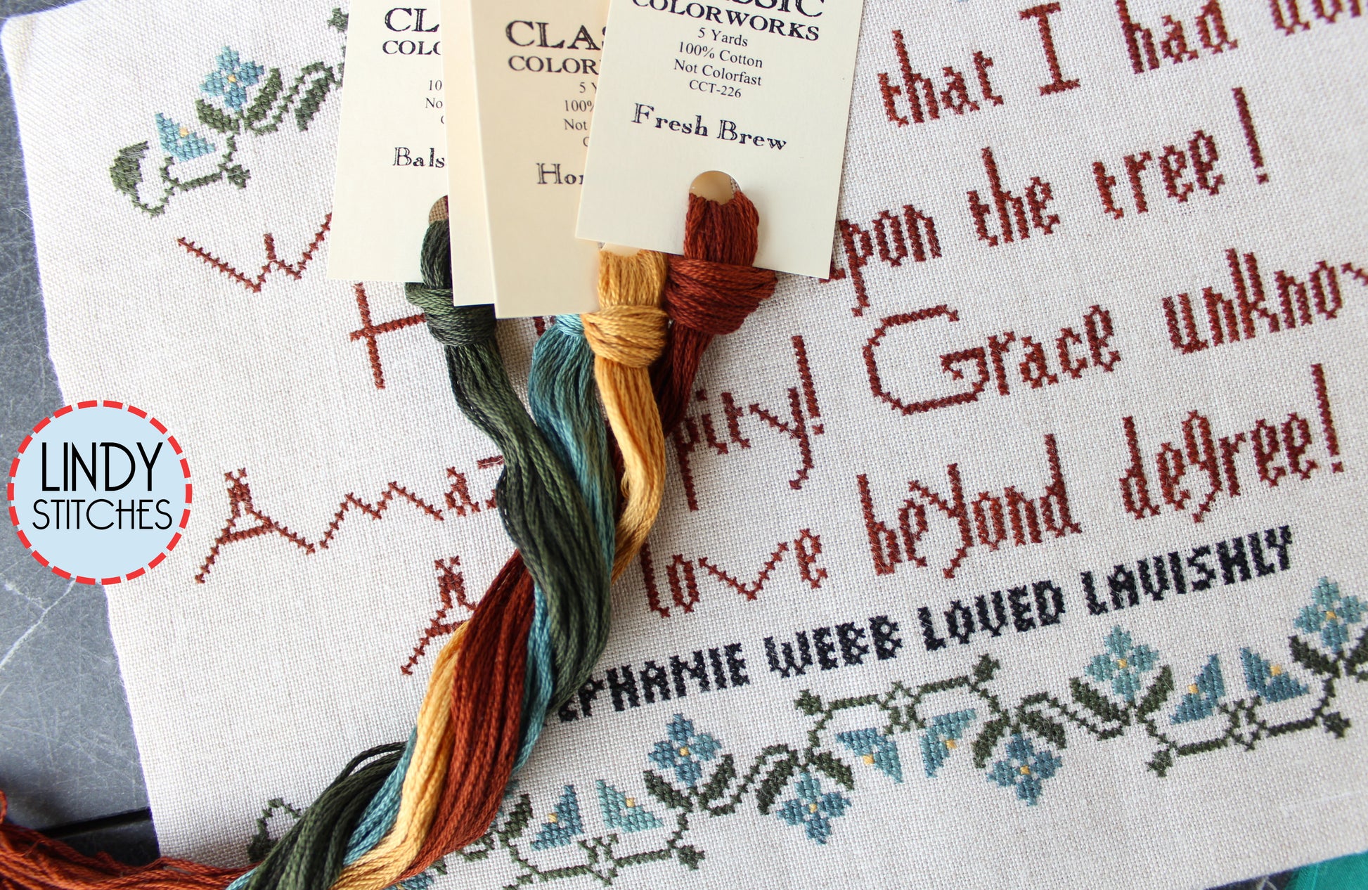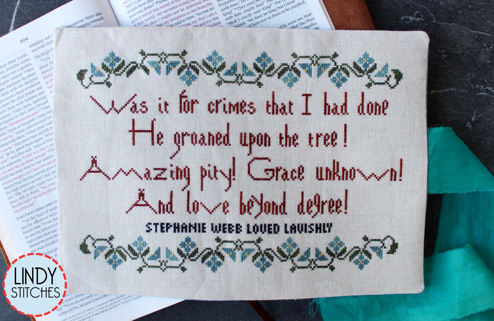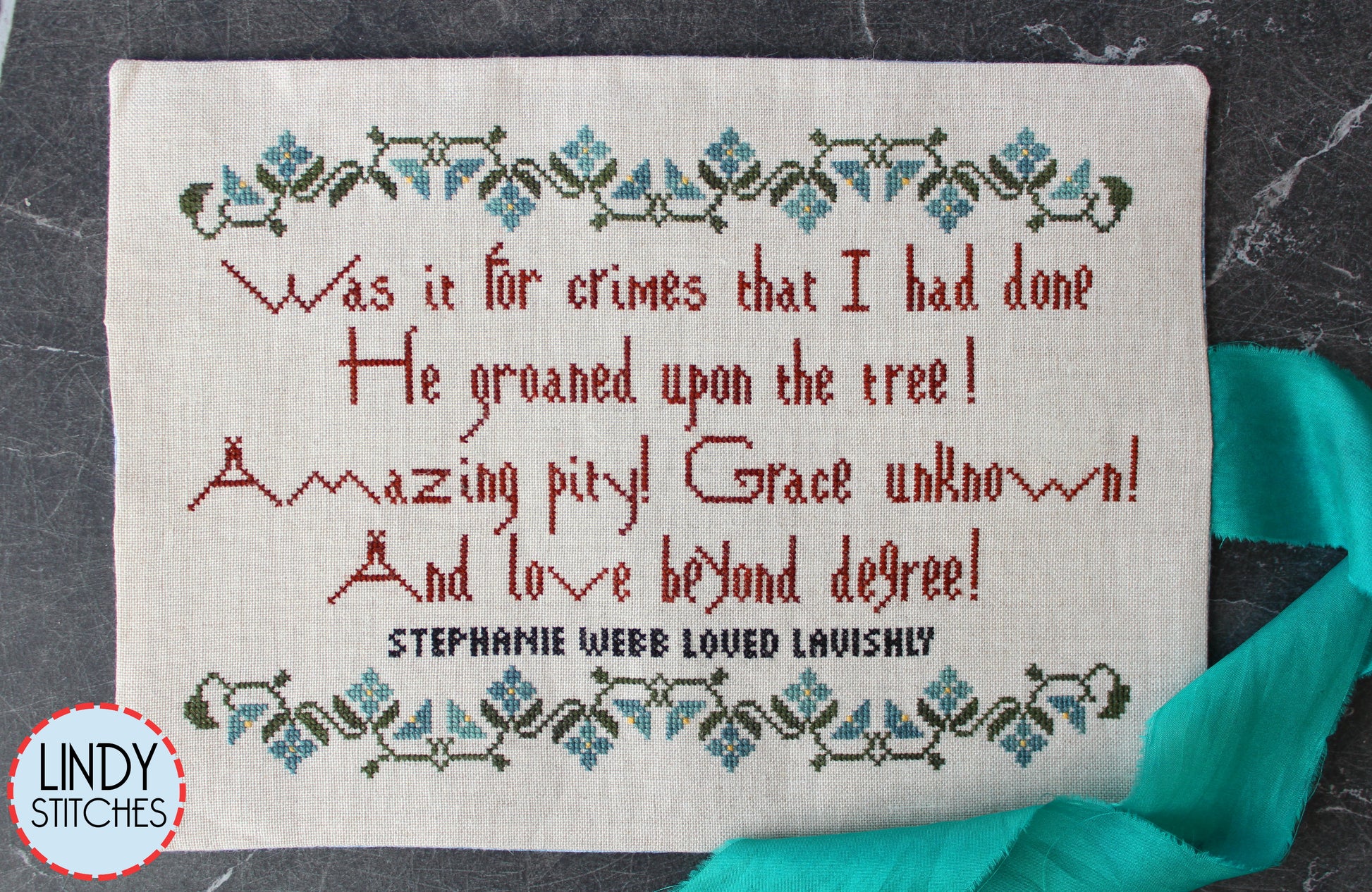 With Easter fast approaching, this was exactly what I needed. When I stitch words, I meditate on them. The text is from Isaac Watt's beautiful hymn written in 1707, and they describe exactly how I feel about the cross. I was happy to sign my name in black thread----my testimony, my gratitude. Full alphabet provided so you can do the same.