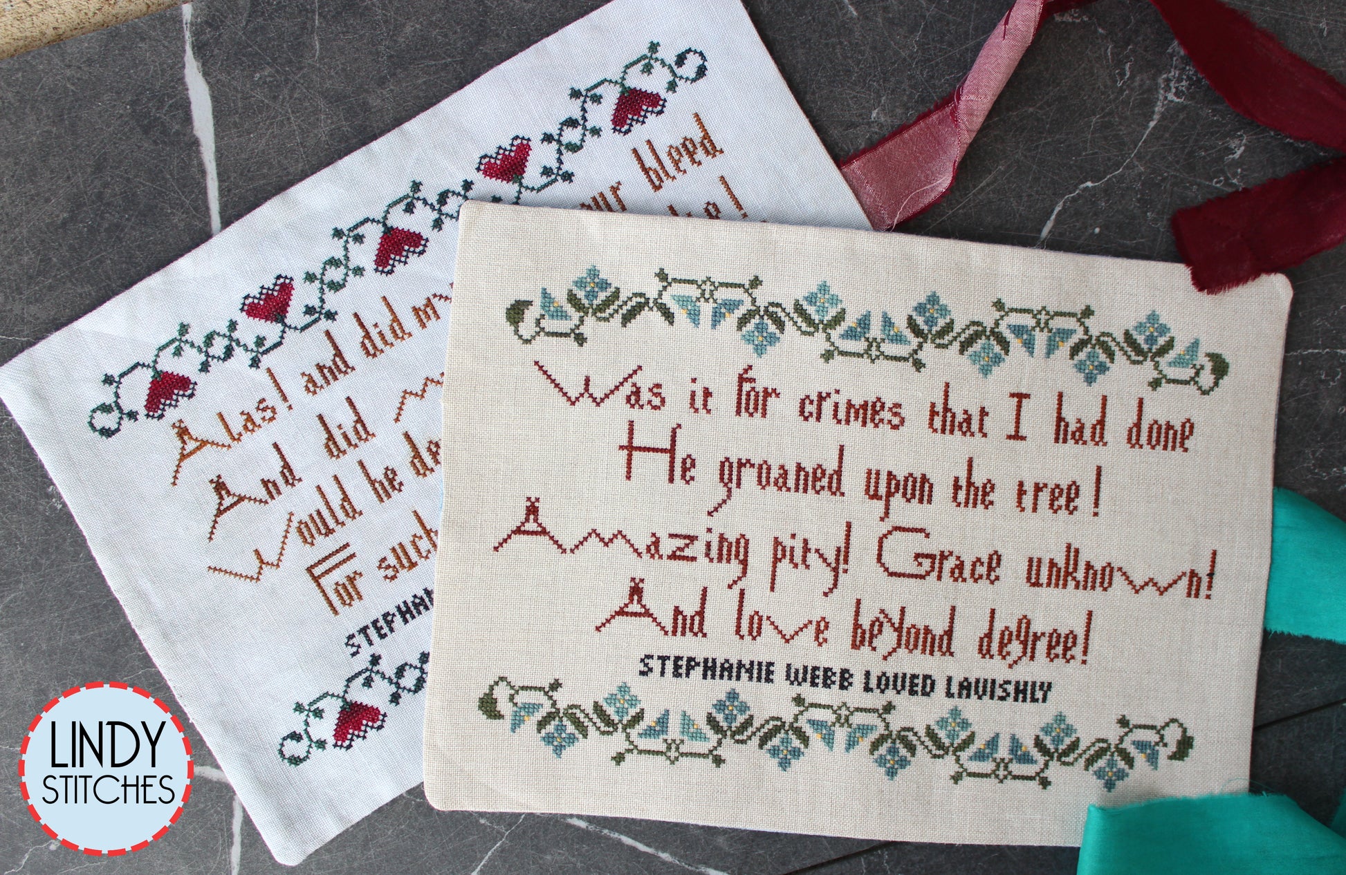 I recently purchased both of these charts and can't wait to get started on them. I am looking at putting both on the same fabric with the hearts across the top and blue flowers across the