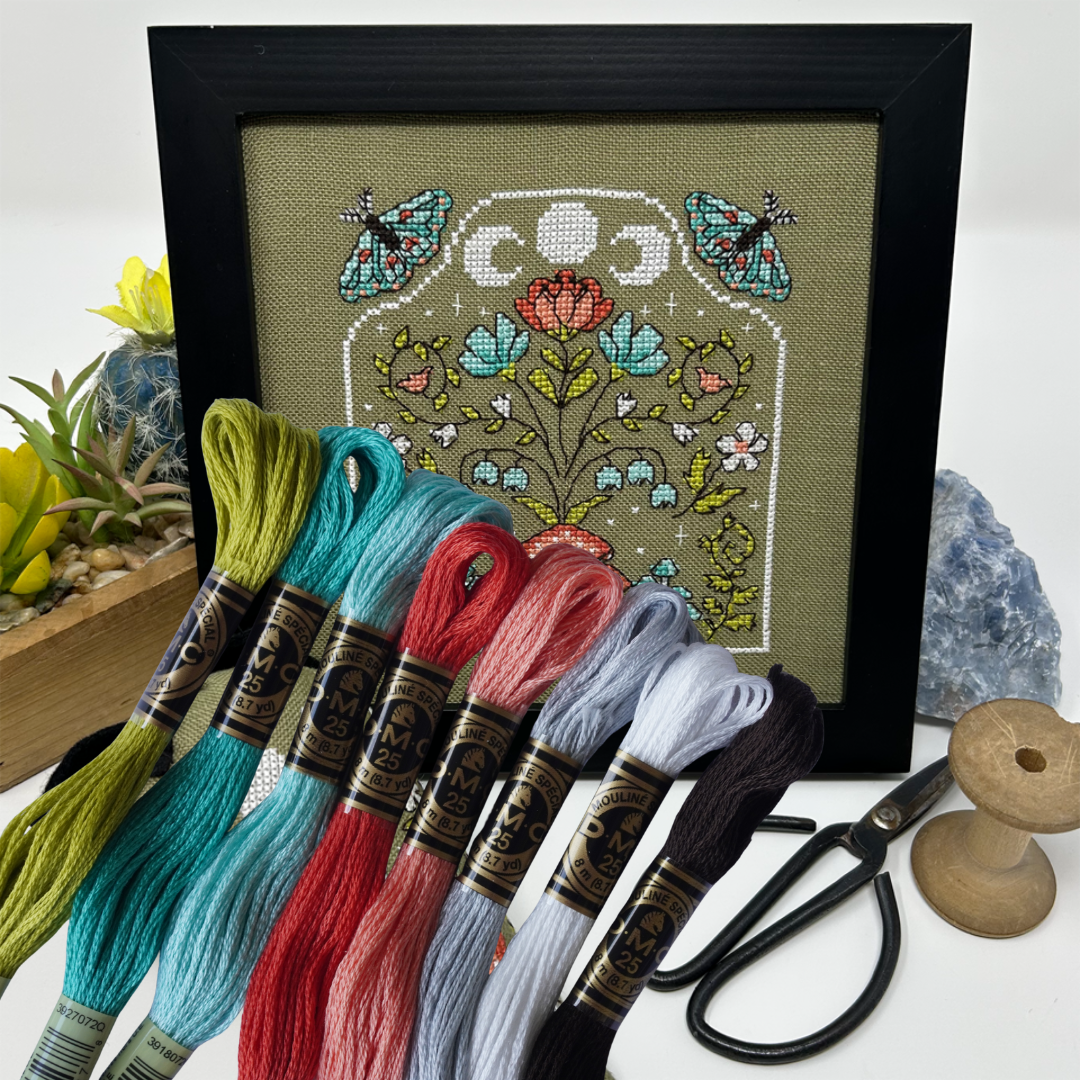 All the DMC you'll need to stitch Dark Forest by Tiny Modernist. You'll receive eight skeins of DMC floss.