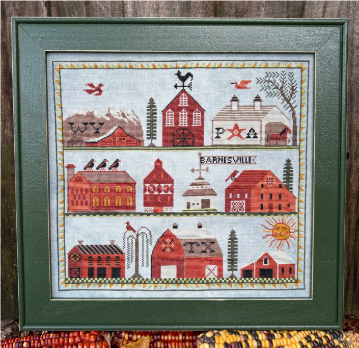Carriage House Samplings BARNESVILLE Cross Stitch Pattern Marty the designer says, "This design was inspired by a road trip from Montana to Florida with my daughter Grace." It includes the large alphabet for personalizing!