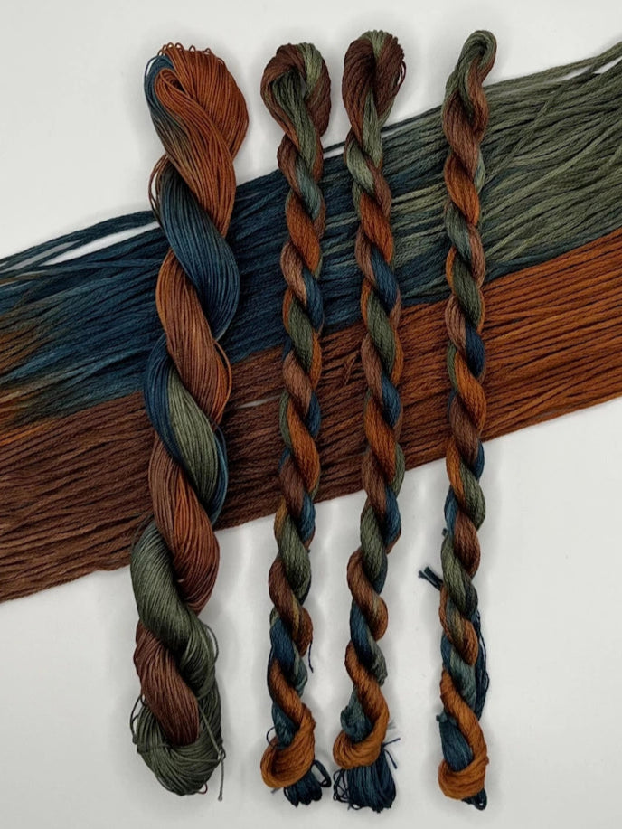 Dark copper is like a rustic cabin tucked away in the cold, dark woods, with a warm hearth and even warmer blanket inside. This is a 6 strand embroidery floss, hand wound in 10 yard skeins and dyed in small batches to ensure the highest quality. Refined with love and artistry, this floss would make a lovely addition to many projects. Always test before washing.