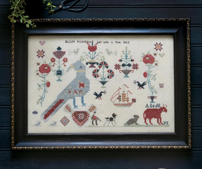 Red Bull & Odd bird Cross Stitch Pattern by Plum Street Samplers. What drew me to this sampler was the oversized, unusual bird (I am always drawn to odd birds on samplers!), as well as the little hunter and his English Springer Spaniel (I have two of my own). Ellen must have been a lively little girl, what with her bright color choices and fun motifs. Her sampler was finished in 1852, when she was just 11 years old. You'll notice on the bottom right corner another initial and age, next to some simpler motifs than what are found in the rest of the sampler; the model stitcher (Natalia Canaday) suggested this could have been her little sister's contribution to the piece. I love the thought of that.