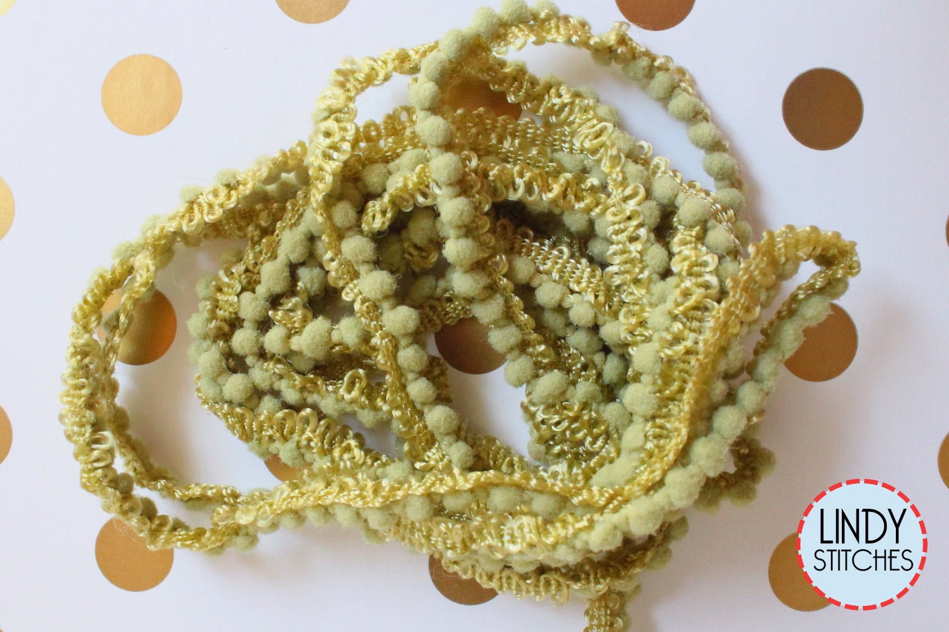 'Witchie' Mini Pom Pom trim by Lady Dot Creates. 2 yards of 100% polyester trim. The perfect shade of spring grass! Approximate DMC shade for Witchie is DMC 3364. Why choose Lady Dot poms? Because they separate from the tape! No more trying to hide it in the seam! Pull the string as shown in the last photo and get some bare naked poms. So easy to whip stitch onto the edge of your project. And if you're making smalls, 2 yards finishes more projects than one!