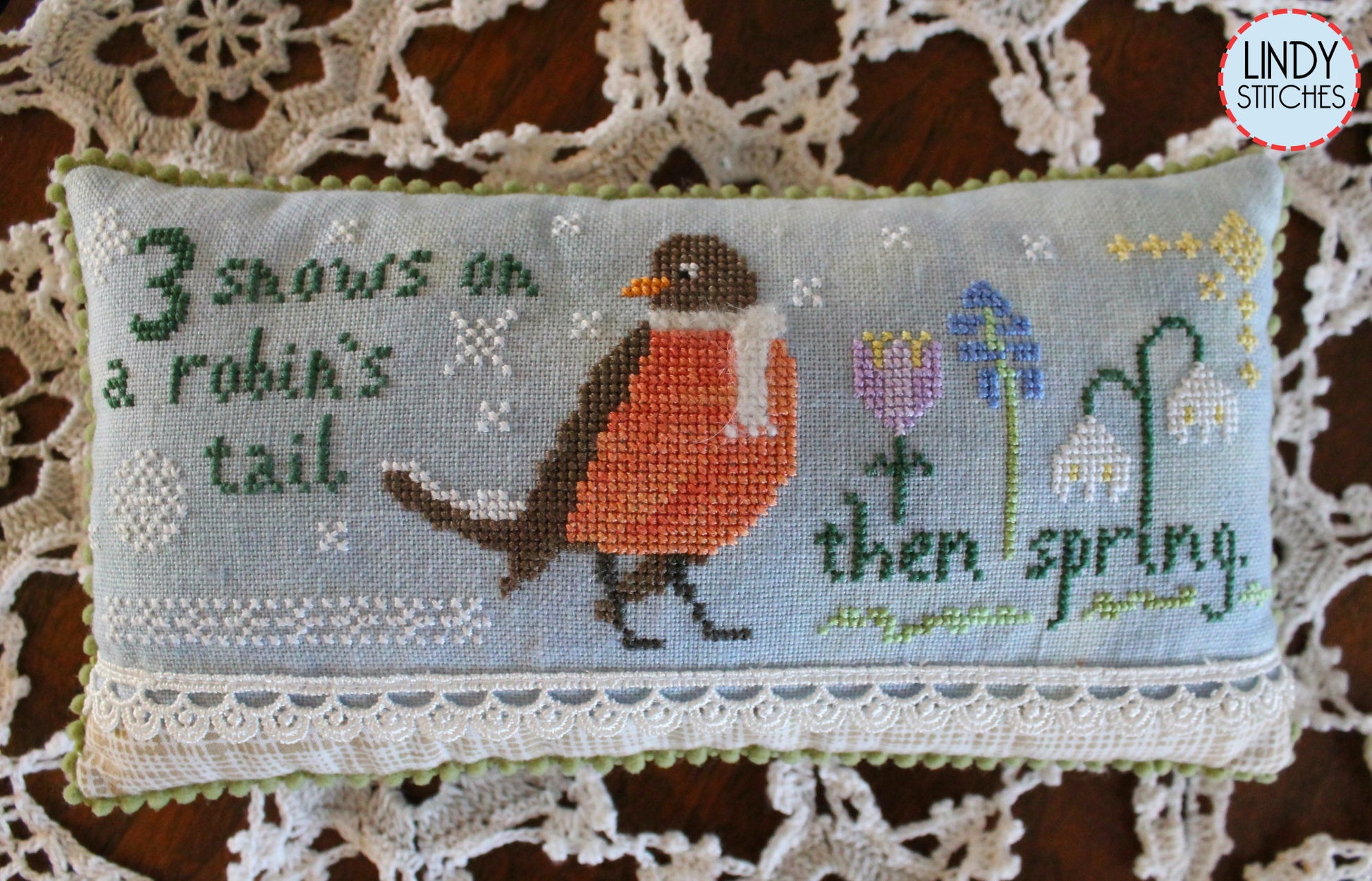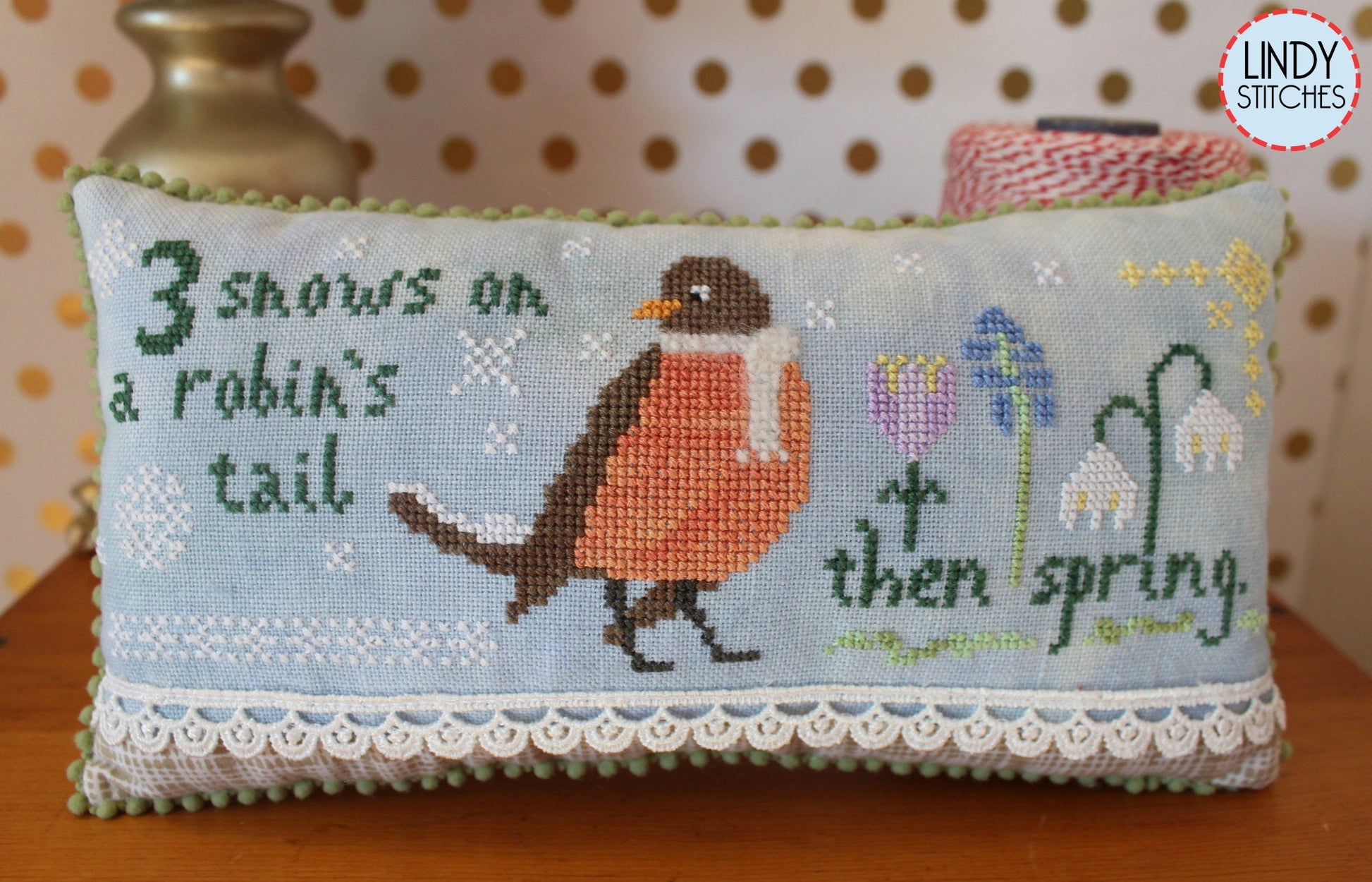 Lindy Stitches uses Witchie Poms in the pattern 3 Snows.