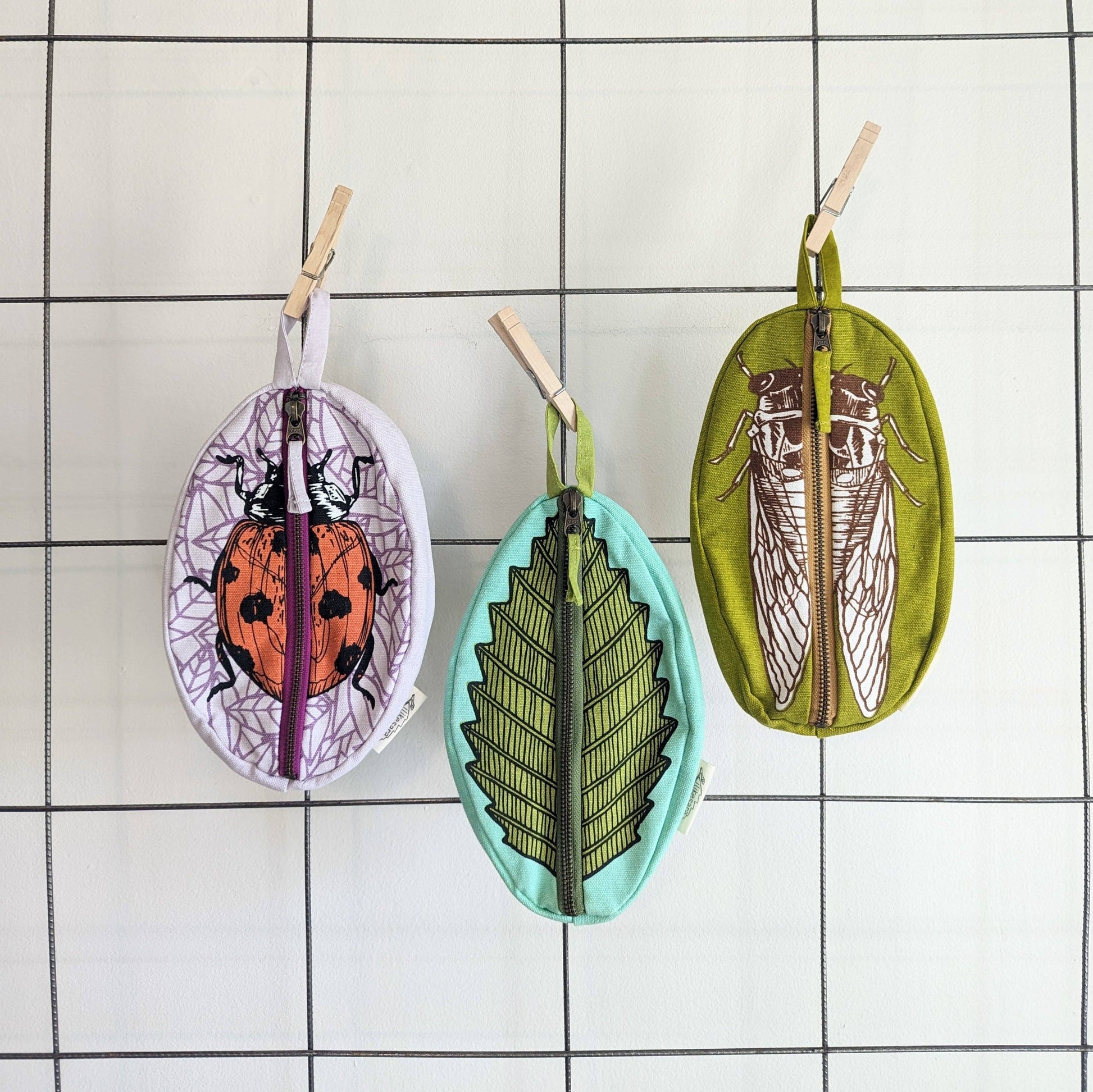 Ladybug zipper pouch. A hand screenprinted and sewn zipper pouch, which displays a ladybug resting amongst leaves on both sides. This ladybug is the perfect travel companion. Allow her to store your pencils, small supplies, cosmetics, or even snacks. Featuring a water-resistant lining, metal zipper, and carrying loop, this pouch design is based on an original illustration by ilikesara / Sara Schalliol-Hodge. This zipper pouch is double sided -lilac, purple, orangey red, black, and white -pouch area measures 9" long, 5.5" wide, and 1" thick -2" carrying loop -cotton canvas with water-resistant lining -metal zipper -hand screenprinted Use it as a.. -pencil pouch -gift bag -cosmetic bag -purse organizer -treasure pouch -snack bag